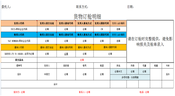 至此,請各客戶配合,6月1號起,除了運輸托運單以外,在訂艙時提交以下貨物訂艙清單,以便我司操作人員快速處理訂艙及申報工作。處理過程中如果因資料不全,不完整,不準確引起的申報不暢等問題,我們一起耐心處理,一同解決。感謝你們的支持與配合!